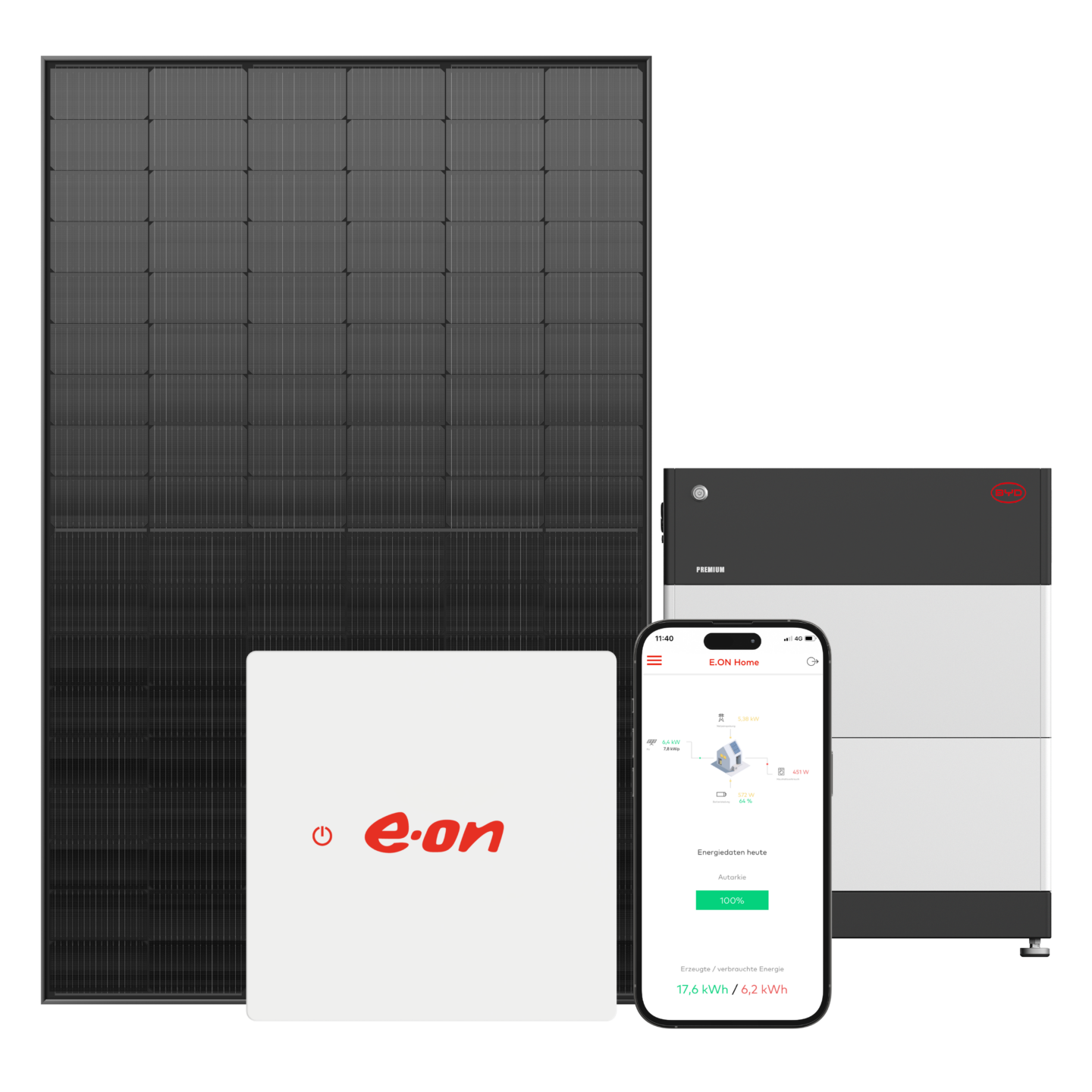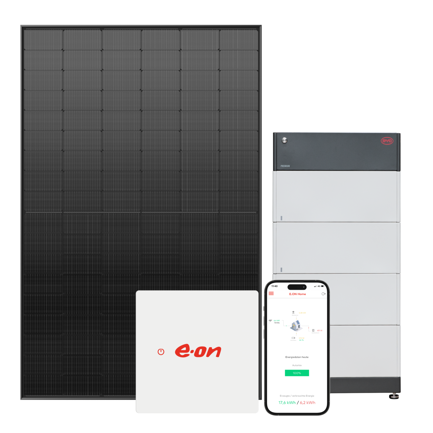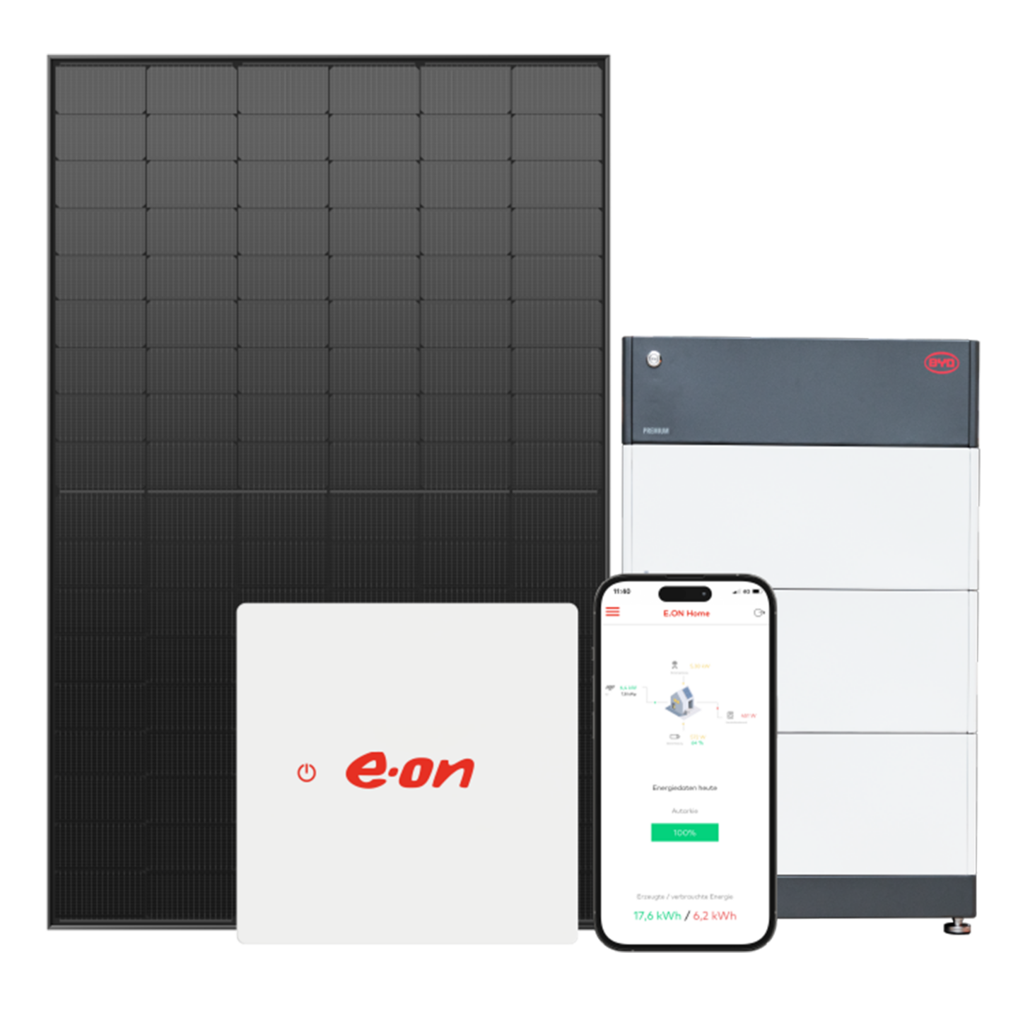⁶ Der Preis für das Solar Komplett L gilt nur für den Kauf eines Solarpakets in der Konfiguration 13 kWp PV-Anlage, 10 kWh Batteriespeicher und dem E.ON Home Energiemanager bei unseren 100 % E.ON Tochtergesellschaften. Anbieter und Vertragspartner für die Nutzung und die Services des E.ON Home Energiemanagers ist die E.ON Energie Deutschland GmbH. Das Angebot beinhaltet Material, Planung, Lieferung und Installation sowie Gerüstkosten bis zu einer Gerüstgröße von 50 m². Objektspezifische Mehrkosten (z. B. Zählerschrank, Potenzialausgleich) sind nicht im Paketpreis enthalten. Endpreise können daher abweichen. Das Angebot gilt ausschließlich für Privatkunden mit Wohnsitz in Deutschland.